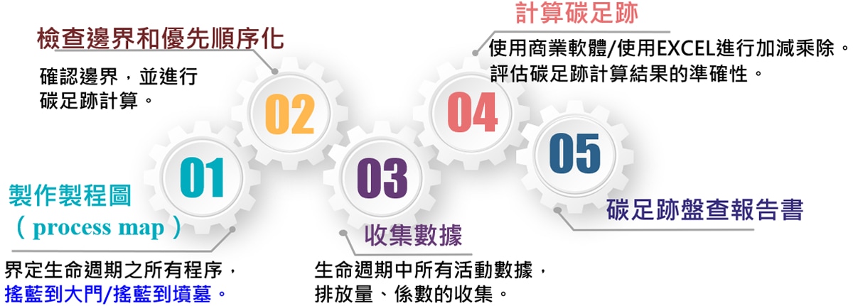 本公司具備專業顧問團隊,熟悉 ISO 14067、PAS 2050 與 LCA 方法論,能協助企業依據國際標準完成碳足跡盤查,從規劃、數據蒐集到報告揭露,提供一站式輔導服務。我們不僅協助企業建立符合第三方查證的報告,更能釐清碳管理上的風險與機會,協助企業展現永續承諾,提升品牌形象與國際競爭力。盤查流程通常包含五大步驟:製作製程圖、檢查邊界與優先順序化、收集數據、計算碳足跡及撰寫盤查報告。透過這套方法,企業能全面掌握碳排熱點,符合國際供應鏈與品牌商的要求,並進一步推動具體減碳策略,強化永續競爭優勢。